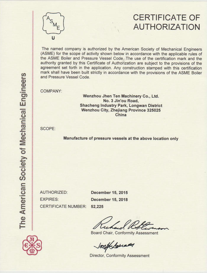 我公司于2015年12月15日正式取得ASME證書,證書范圍為“U-1”。這也是溫州市首張ASME范圍U-1證書。證書的取得也標(biāo)志著溫州鎮(zhèn)田機(jī)械有限公司的壓力容器制造已經(jīng)邁出了新的一步。
