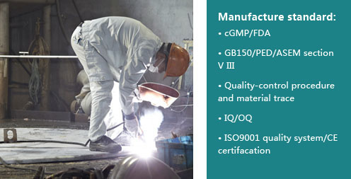 Clean vessel can be either a stand-alone device, it can also be automated processing equipment units. Installed at the customer site as a function module, include mix, homogeneous, disperse, Measure and connect with the control unit, valve and pipe. Jhenten can provide all kind of clean vessel to satisfy the biological pharmacy, food and beverage, chemical process requirement. We have the qualification of manufacturing D1/D2 pressure vessel. Professional design team and the mature manufacturing process can help customer to choose correct equipment and fully ensure your products safe and reliable and efficient usage.